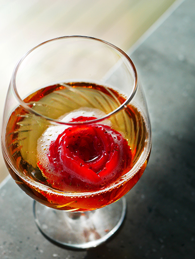 尾道で店舗を持たずに展開しているwatakabe coffeeの自家焙煎珈琲を使った苺のカクテル。グラスをくゆらせると、きらきら輝くラメも、心ときめくポイント。