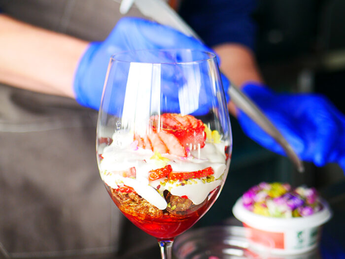 苺×練乳の王道の組み合わせ。グラスを持ち上げると零れ落ちる真っ赤な苺を練乳ホイップがやさしく包み込みます。遊び心もある、苺好きにはたまらない、苺を存分に楽しめるデザート。